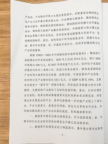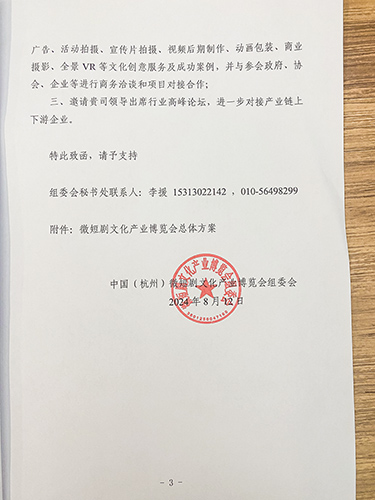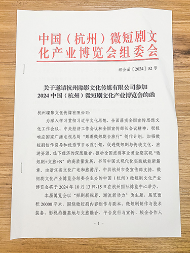 近日,杭州文化传媒有限公司收到中国(杭州)微短剧文化产业博览会组委会的邀请,拟出席2024年10月13日至15日在杭州国际博览中心举办的杭州微短剧博览会。